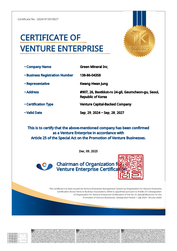 그린미네랄, ‘ESG KOREA 2025’ 최종 선정… 152개 팀 중 15개 혁신 스타트업에 당당히 이름 …