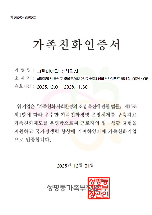 인증 수여식은 11일 서울 더케이호텔에서 산업통상자원부의 주관으로 진행됐으며 산업기술혁신 촉진법 시행령에 따라 인증 기술이 공고됐다. 그린미네랄은 이번 신기술 인증을 통해 기술 상용화 및 글로벌 시장 진출에 더욱 박차를 가할 계획이다.